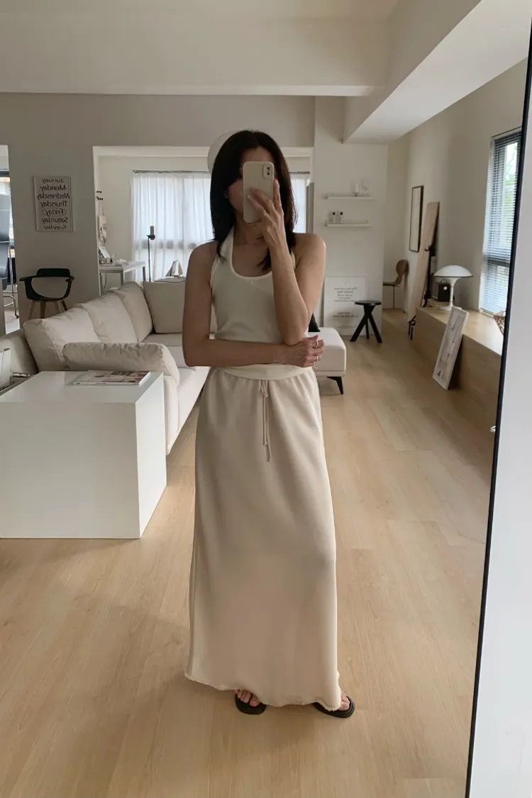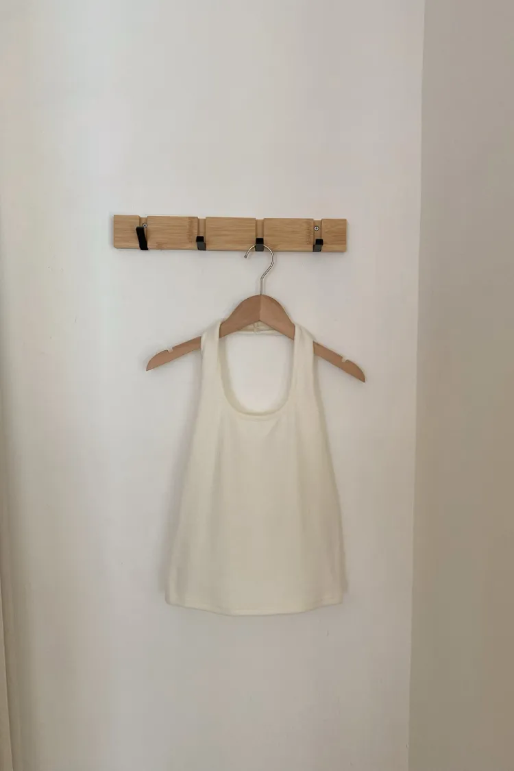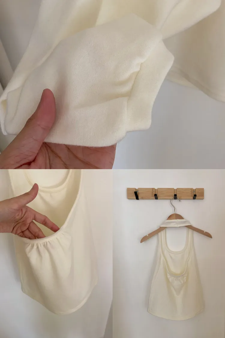 掛脖背心背面加了鬆緊帶,穿起來很穩、不用一直拉。