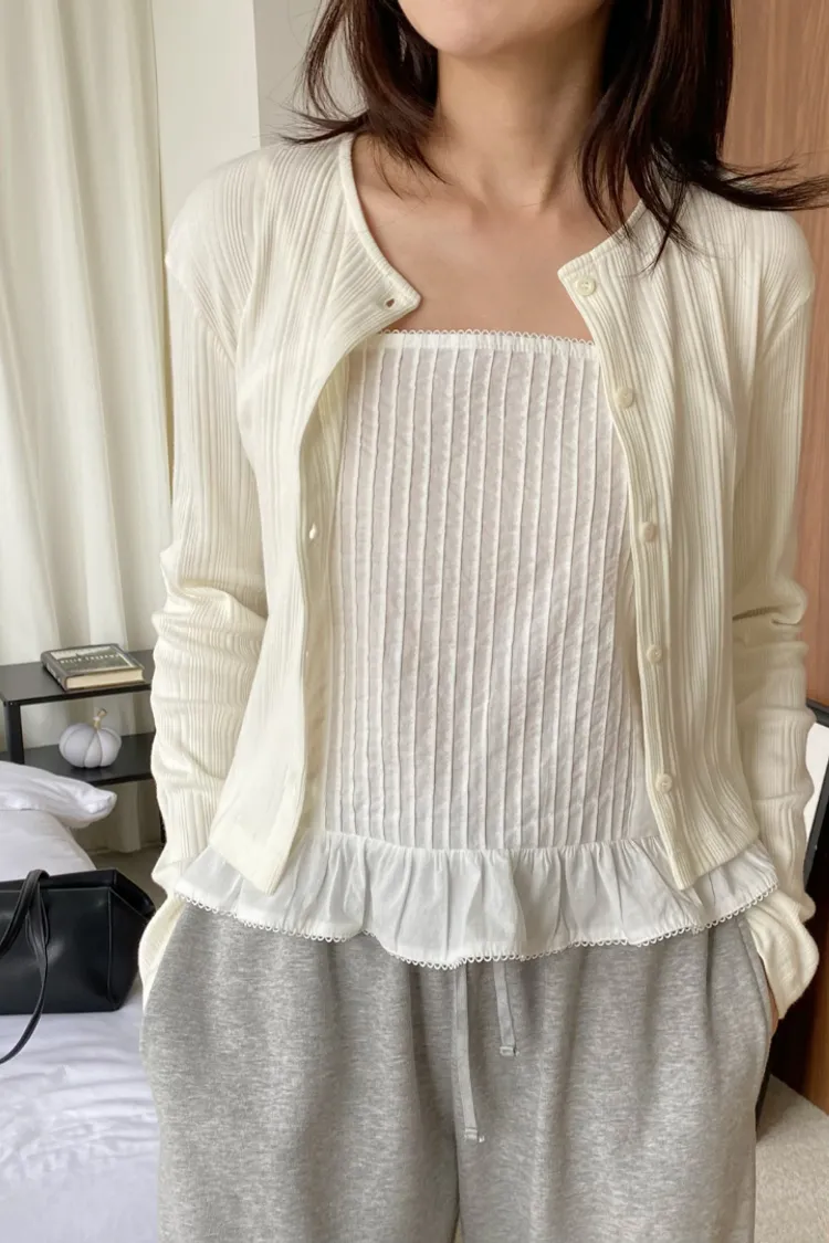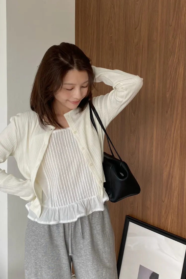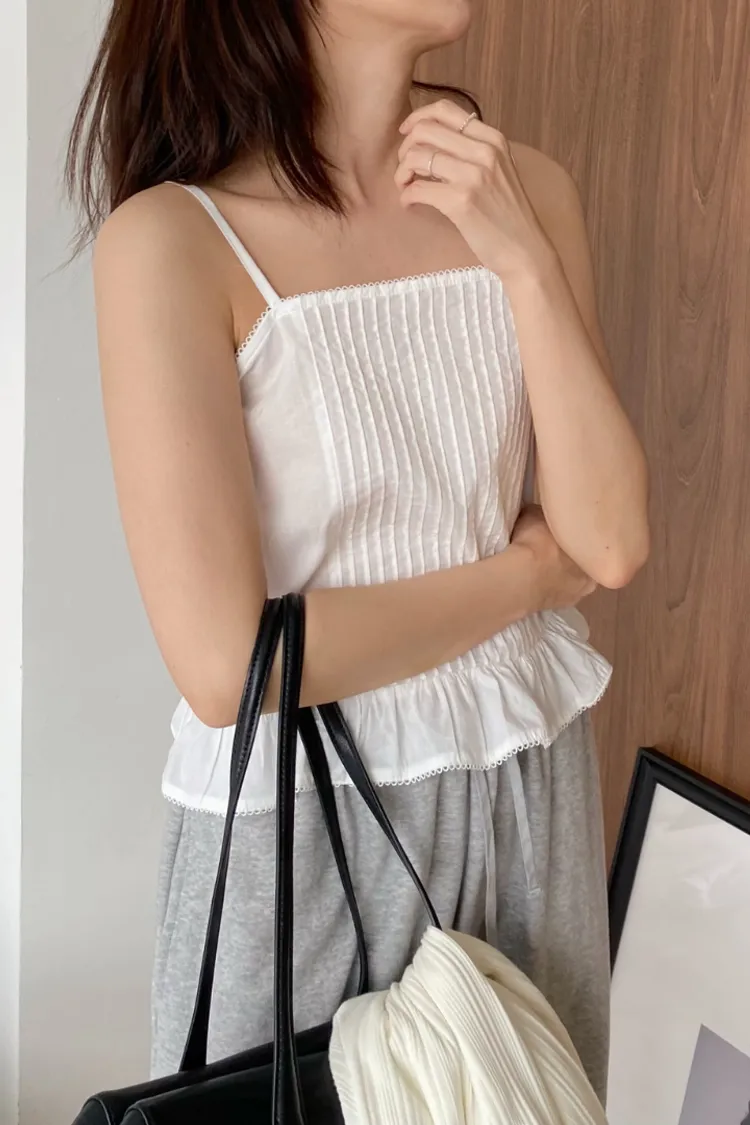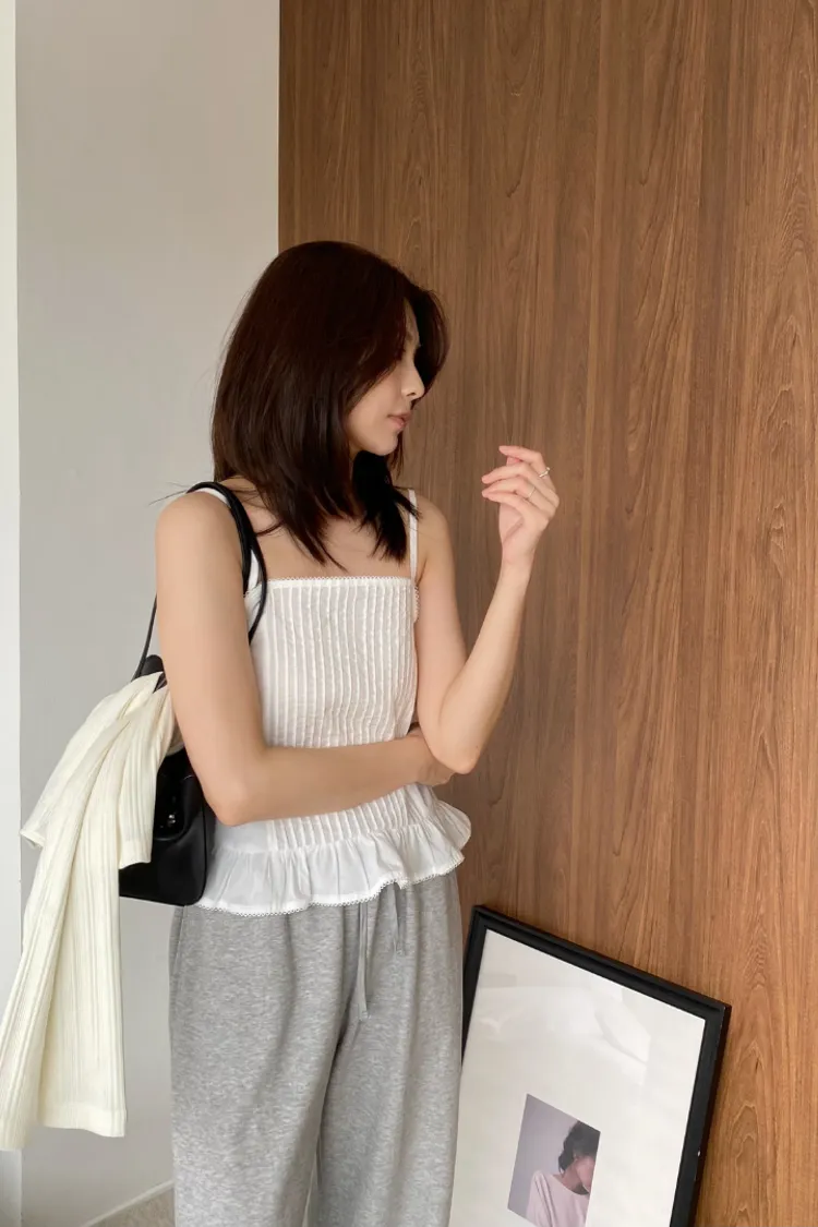 說明:肩帶可調。荷葉邊下擺和皺摺設計很甜美,
